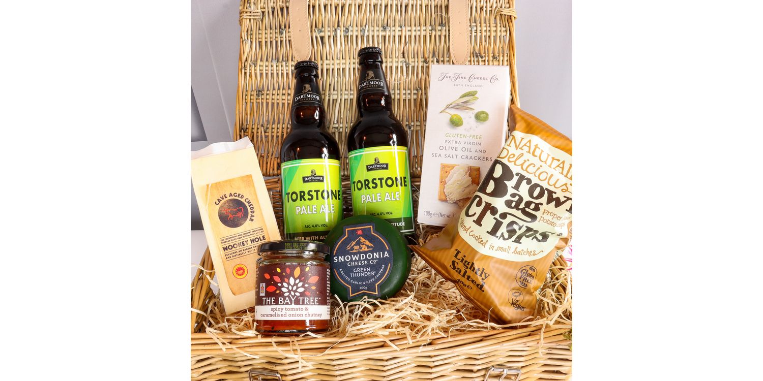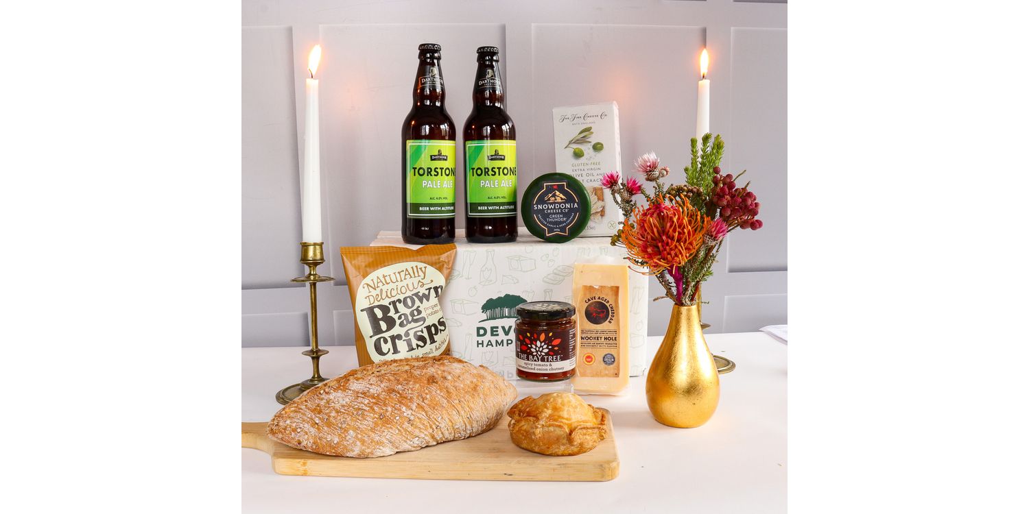 This Ploughman's hamper brings together traditional pub fare in a convenient gift package, featuring locally brewed beer, artisan bread, mature cheeses, and classic accompaniments. The hamper includes two bottles of Dartmoor IPA 500ml - a refreshing pale ale with crisp notes of spicy apple and citrus, paired with fresh sourdough bread with a crisp crust and airy, chewy texture.