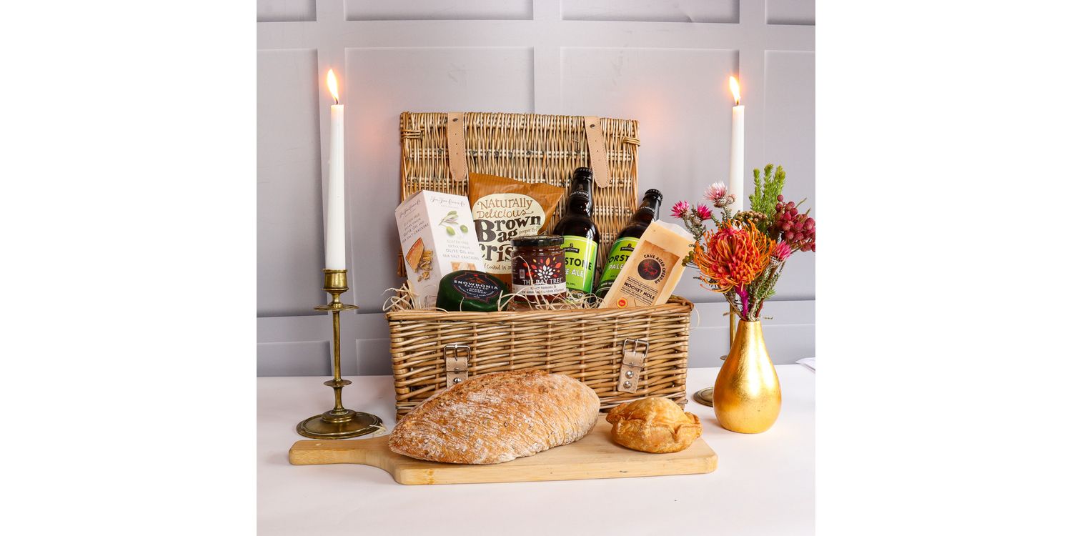 Completing this traditional food hamper are Furniss Original Cheddar Biscuits made with West Country cheddar, a Traditional Pork Pie with natural flavours and spice blend, and Burts Sea Salt Crisps made from 100% British potatoes and hand-cooked for exceptional taste.